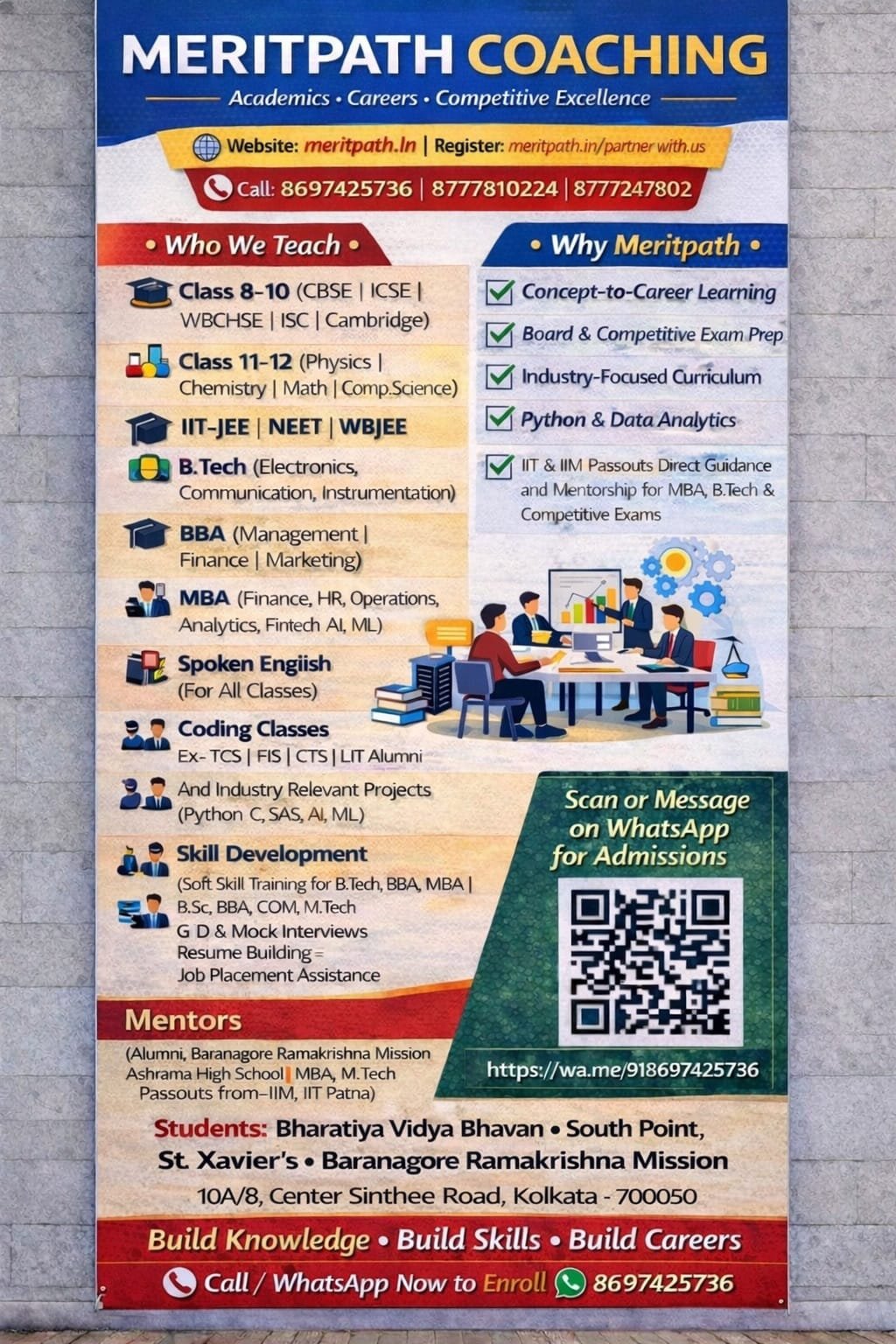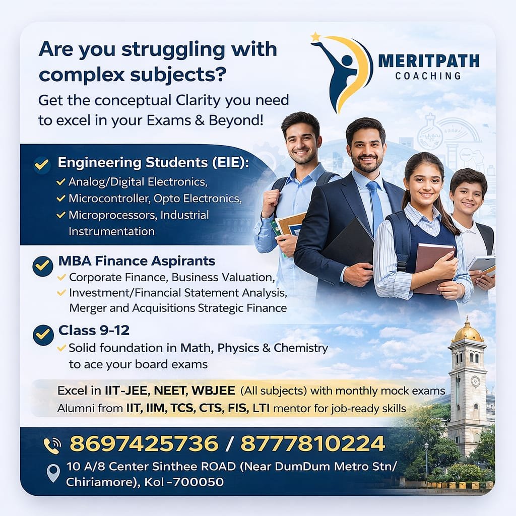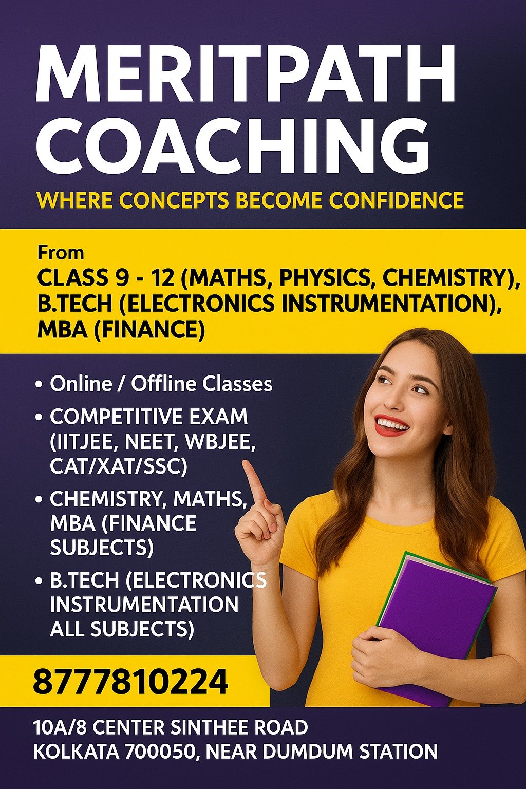 Meritpath Coaching is a premier coaching center located in Sinthee, Kolkata. We specialize in providing expert guidance to students from Class 8 to 12, as well as those preparing for competitive exams like IIT-JEE, NEET, B.Tech, BBA, and MBA. Our institute is renowned for its concept-driven learning approach, which is designed to enhance academic performance and support career aspirations. With a team of experienced educators, we offer personalized mentoring and structured preparation to help students achieve their goals. Trust Meritpath to provide quality education and a pathway to success.