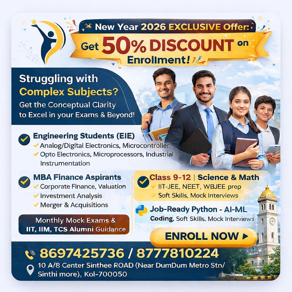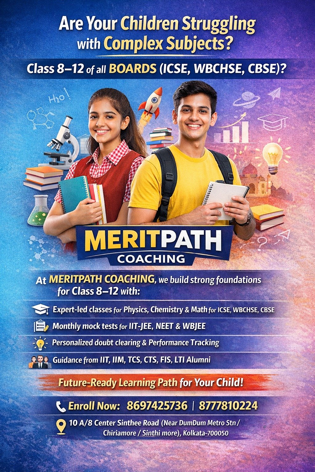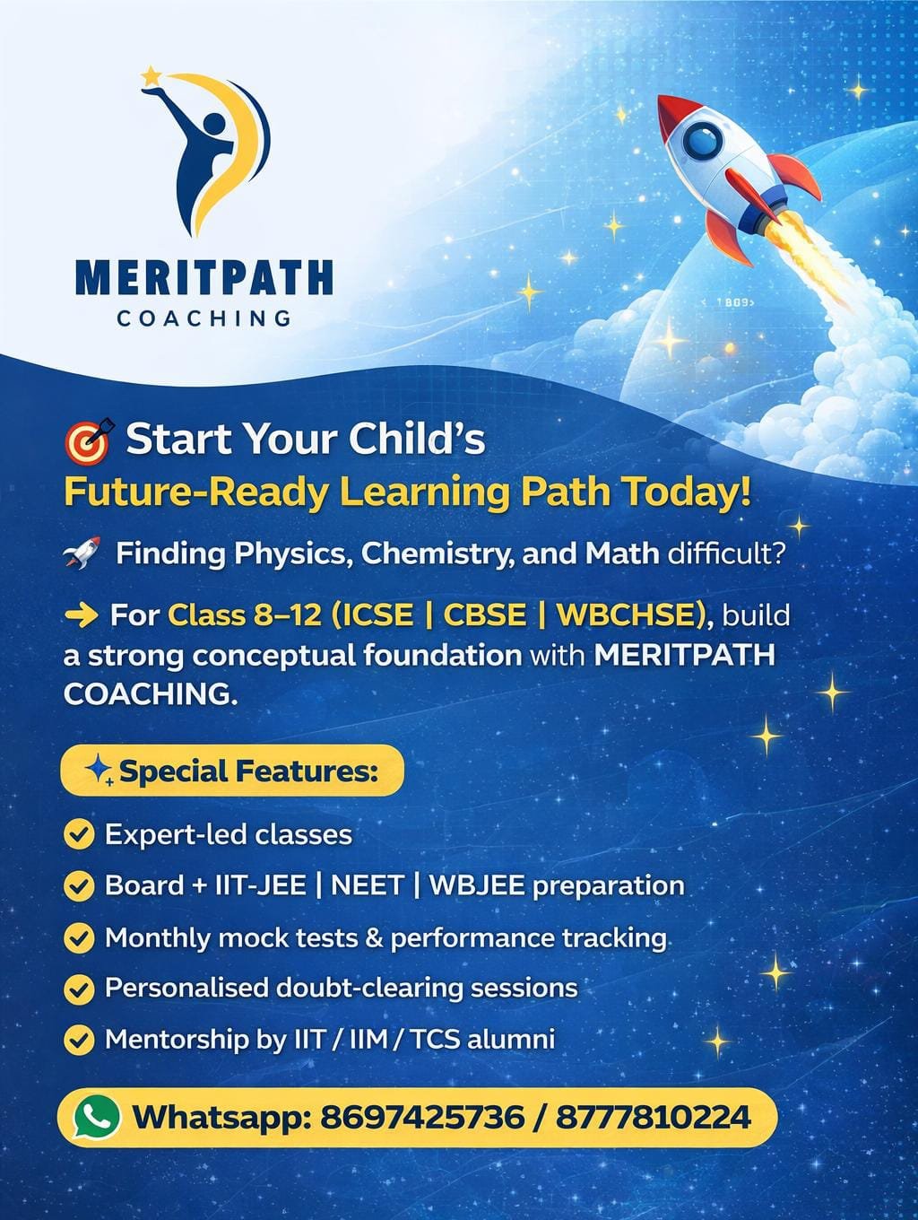 Meritpath Coaching is a premier coaching center located in Sinthee, Kolkata. We specialize in providing expert guidance to students from Class 8 to 12, as well as those preparing for competitive exams like IIT-JEE, NEET, B.Tech, BBA, and MBA. Our institute is renowned for its concept-driven learning approach, which is designed to enhance academic performance and support career aspirations. With a team of experienced educators, we offer personalized mentoring and structured preparation to help students achieve their goals. Trust Meritpath to provide quality education and a pathway to success.